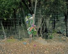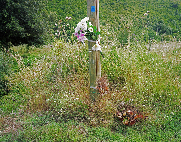 Le long des routes en Corse, des apparitions fugaces, parfois brutales ponctuent le paysage : une stèle, une bougie, une croix, un éclat éphémère de fleurs vives, une couronne fanée… Des signes qui perdurent ou s’estompent ; des empreintes qui témoignent et matérialisent le drame au cœur du paysage. Des lieux charnières où coexistent l’universel et le particulier, où s’exacerbe la conscience de l’instant au-delà du présent.